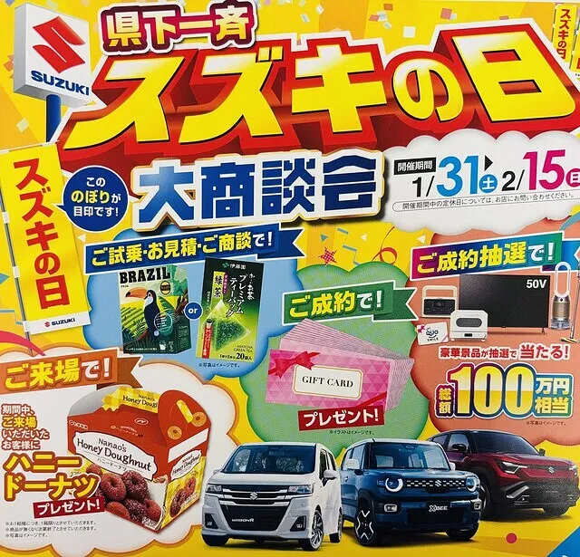 新車市場カーベル静岡です!2/7(土)、8(日)はスズキ&ダイハツがとってもお得な2日間!ご来店&試乗プレゼントに成約プレゼントも♪さらにご成約の方にはWチャンスプレゼント★スズキ車&ダイハツ車を買うなら静岡市駿河区の新車市場カーベル静岡へ!
