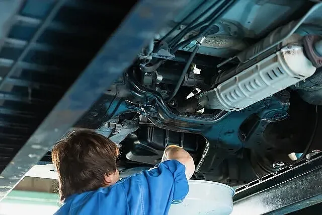 次はプロの整備士による点検・整備。リフトアップ、下回りの確認。